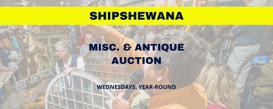 The Shipshewana Misc. & Antique Auction at Shipshewana Auction is held every Wednesday, year-round at 9 am. (Exception Closed the week of Christmas & New Year's) The auction is held in the Shipshewana Auction Misc. & Antique Building (an 80' by 200' enclosed facility, heated in the winter and open-air in the summer). Six to Nine auctioneers simultaneously sell antiques, collectibles, primitives, instruments, architectural salvage, toys, signs, glassware, tools, furniture, and miscellaneous items.